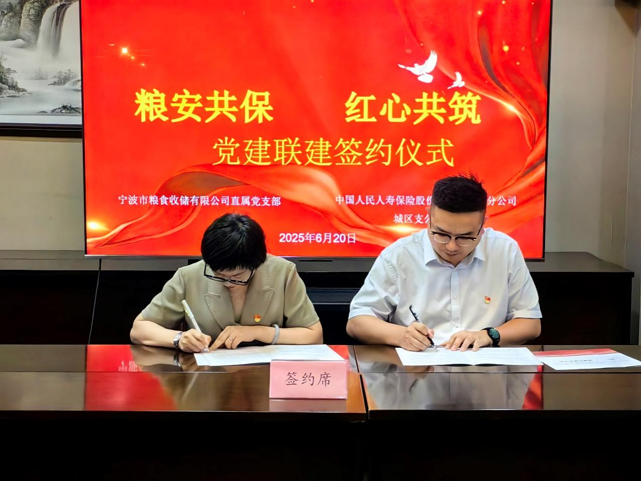 簽約儀式上,在公司黨總支書記、董事長林榮和中國人民人壽保險(xiǎn)股份有限公司寧波市分公司黨建工作部總經(jīng)理李峰的見證下,公司直屬黨支部書記陳丹丹與城區(qū)支公司黨支部書記陳園斌共同簽署黨建共建協(xié)議,明確以“組織共建、資源共享、發(fā)展共促”為目標(biāo),通過黨建聯(lián)建、業(yè)務(wù)協(xié)同,推動雙方在糧食安全保障和金融服務(wù)領(lǐng)域的深度合作。