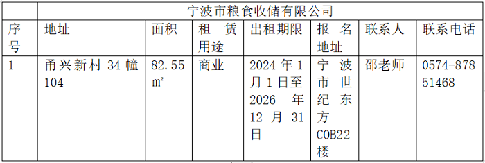 寧波市糧食收儲(chǔ)有限公司現(xiàn)有以下房屋對(duì)外公開(kāi)招租,(各房屋租賃面積、租賃用途、報(bào)名地址、聯(lián)系人、聯(lián)系電話詳見(jiàn)附表)為確保招租工作的公開(kāi)公平公正,現(xiàn)將有關(guān)事項(xiàng)公告如下:
